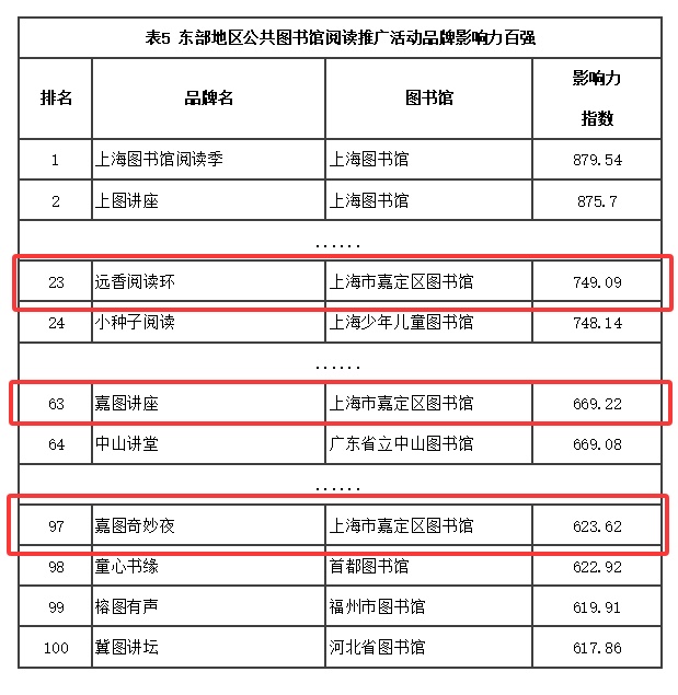 东部地区包括北京市、天津市、河北省、上海市、江苏省、浙江省、福建省、山东省、广东省、海南省,共涉及阅读推广活动品牌1169个。嘉定区图书馆有3个品牌入选百强:远香阅读环位列第23名、嘉图讲座位列第63名、嘉图奇妙夜位列第97名。