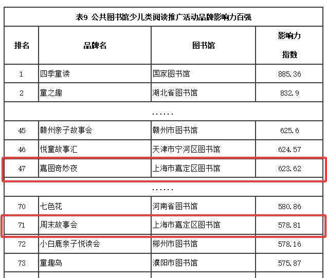 少儿类阅读推广活动是针对特定群体举办的阅读推广活动中最受关注的,共涉及875个。嘉定区图书馆有2个品牌入选百强:嘉图奇妙夜位列第47名、周末故事会位列第71名。