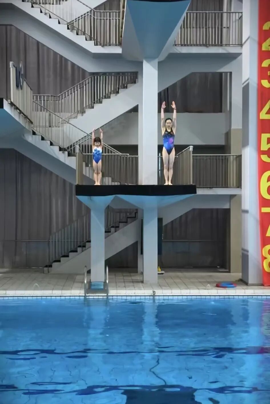 这次母女双人展示,真正让人停下来的,是节奏很稳。吴敏霞的起跳、收紧、入水,还是老样子,干净利落。更让人意外的是,7岁的小朋友没有一点乱,动作完成得很认真,眼神也很专注。
