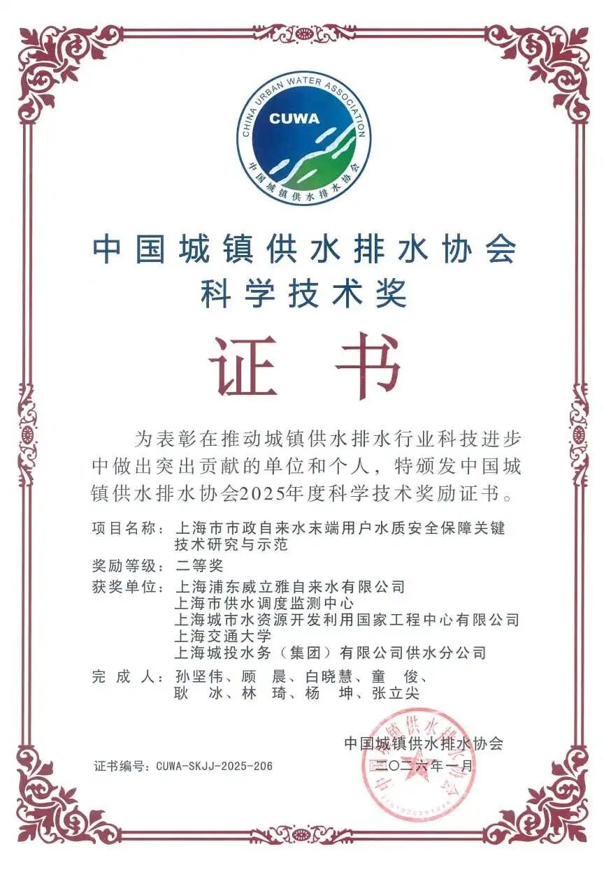 4月16日,2025年度中国城镇供水排水协会科学技术奖颁奖仪式在深圳举行。上海市供水调度监测中心联合上海浦东威立雅自来水有限公司、上海城市水资源开发利用国家工程中心有限公司、上海交通大学、上海城投水务(集团)有限公司供水分公司等5家单位完成的项目“上海市市政自来水末端用户水质安全保障关键技术研究与示范”获中国城镇供水排水协会科学技术奖二等奖。