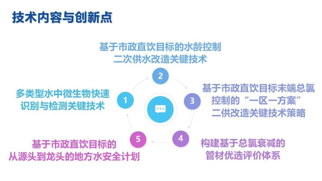 项目紧扣上海市供水水质2035年全面提升并满足国际先进标准发展定位,创建基于水龄智能调控和末端微生物安全的二次供水水质安全保障关键技术体系;开发适用于饮用水贫营养环境的菌落总数检测新方法,突破水中微生物在线检测技术;完成原水、水厂、管网、二次供水全流程风险点评估,提出并验证了以上海市政安全供水为目标的“从源头到龙头”的全过程水安全计划;构建基于多水质评价指数的上海市政自来水末端用户水质安全评估技术体系,技术成果具有先进性。