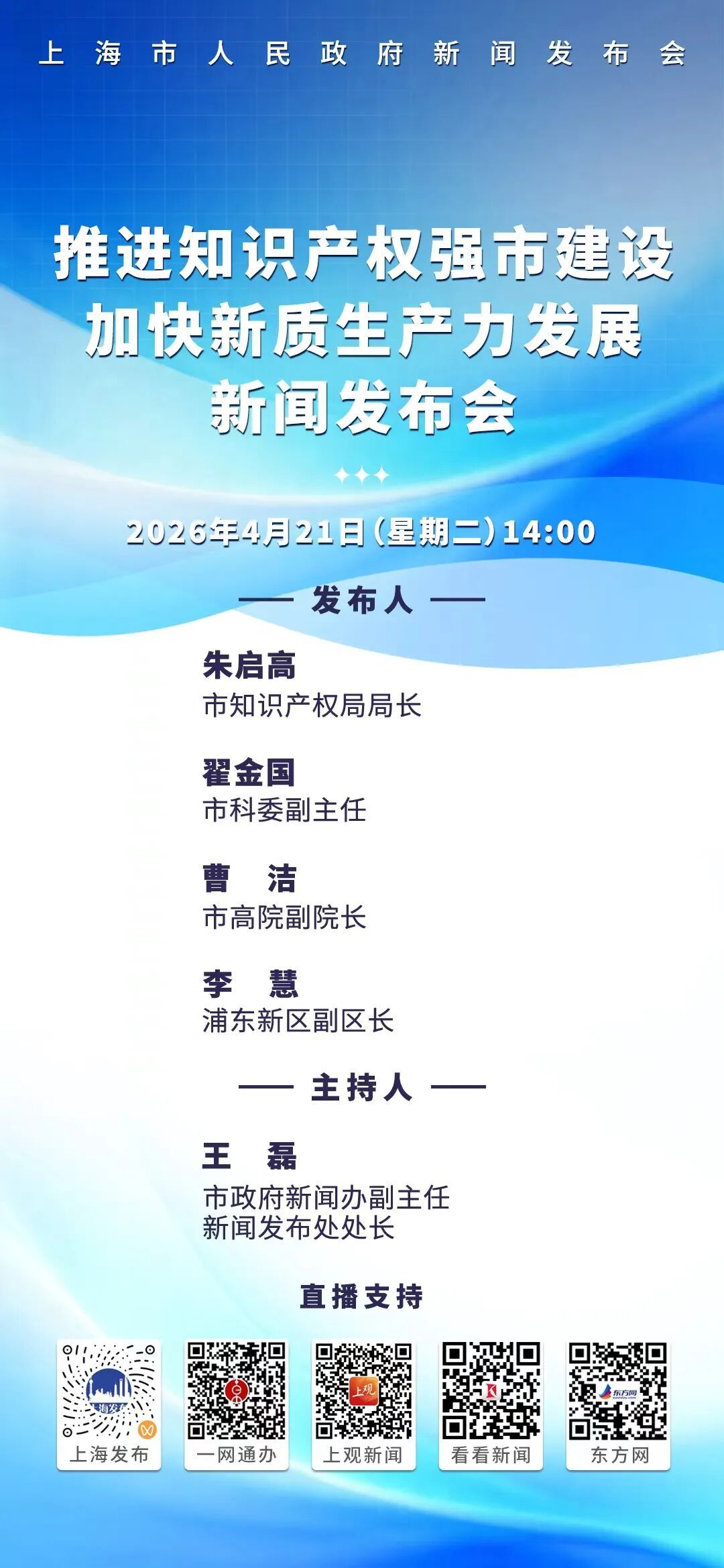 2026年4月21日(星期二)下午14时将举行市政府新闻发布会。市知识产权局局长朱启高,市科委副主任翟金国,市高院副院长曹洁,浦东新区副区长李慧将聚焦“推进知识产权强市建设 加快新质生产力发展”主题,介绍相关工作情况,并答记者问。敬请关注!