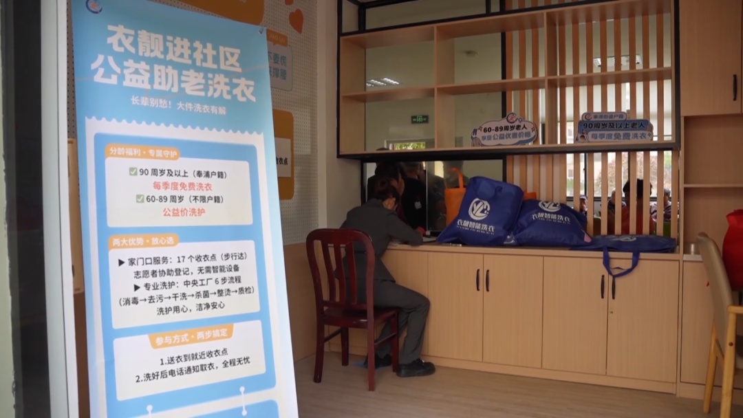 春意渐浓,又到了换季洗衣的忙碌时节。在上海奉贤区奉浦街道的生活驿站里,拎着大包小包的老人们,正有序地在一扇洗衣窗口前排队。这里,是“衣靓公益助老洗衣项目”在全市16个收衣点位之一。