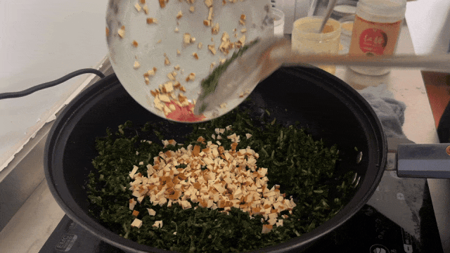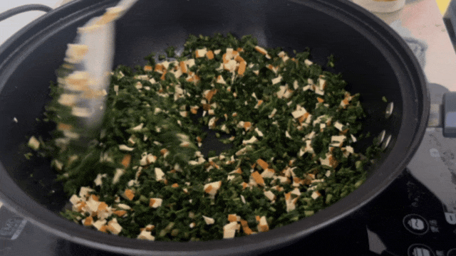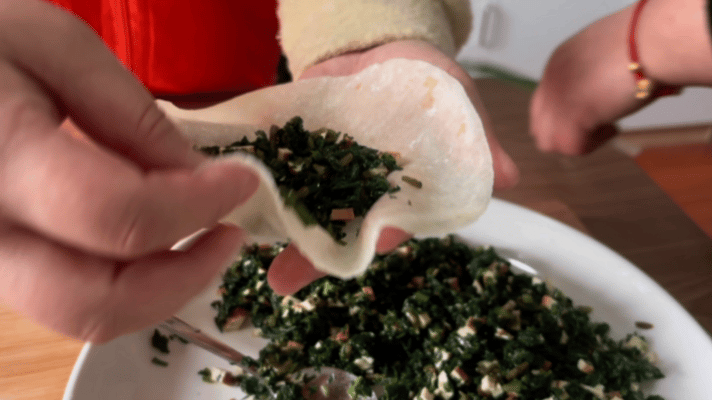 4. 创意升级:用薄软的春饼皮,包入一勺马兰香干馅,轻轻收口扎紧,便做成了寓意美好的“马兰香干福袋”。一口咬下,外皮柔韧,内里是满口清新的田野香气。