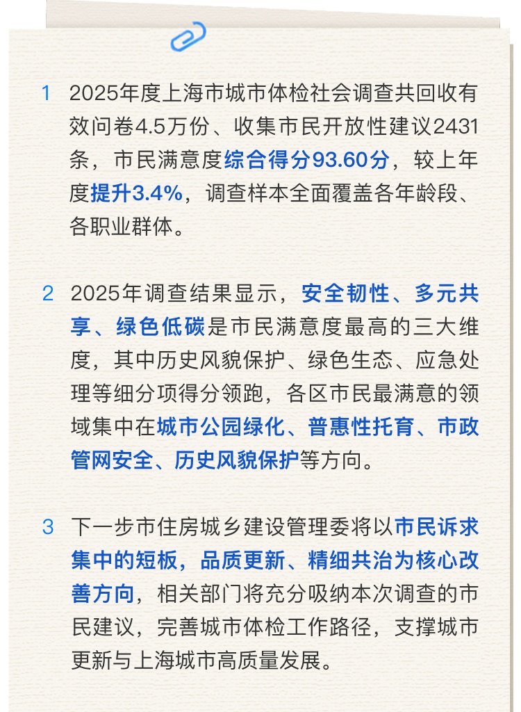 2025年度上海市城市体检社会调查共回收有效问卷4.5万份,收集市民开放性建议2431条,满意度综合得分93.60分,较上年度提升3.4%,调查样本覆盖各年龄段、职业群体。