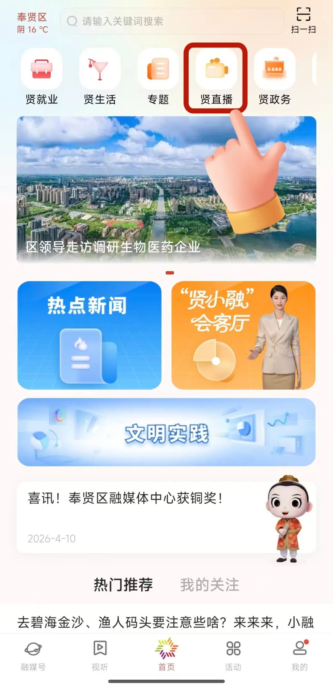 2.打开“美谷奉贤”APP,点击“贤直播”