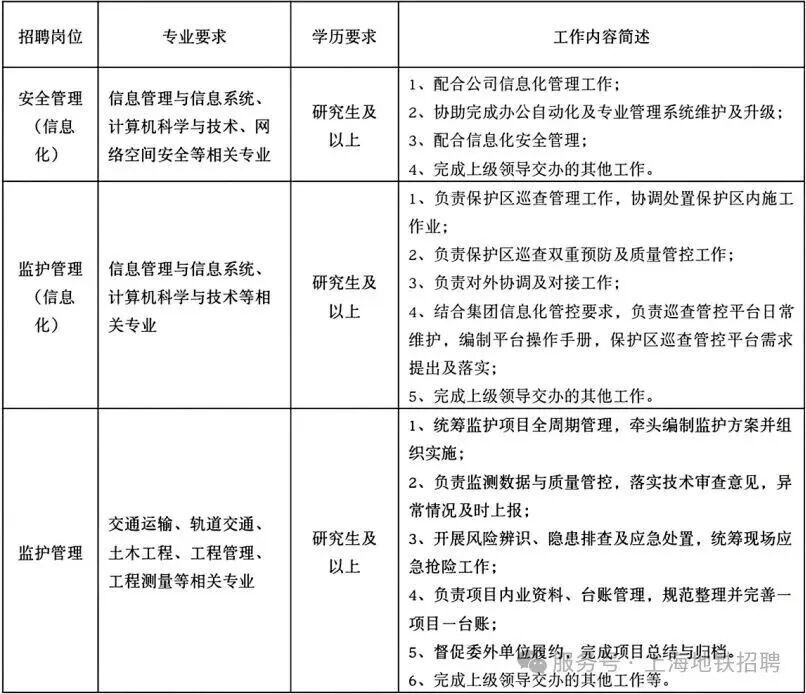 请应聘者关注微信公众号:上海地铁招聘,查阅招聘岗位、专业及学历具体要求,有意向者请于2026年4月30日前投递简历,上海地铁监护管理有限公司将择优安排面试。