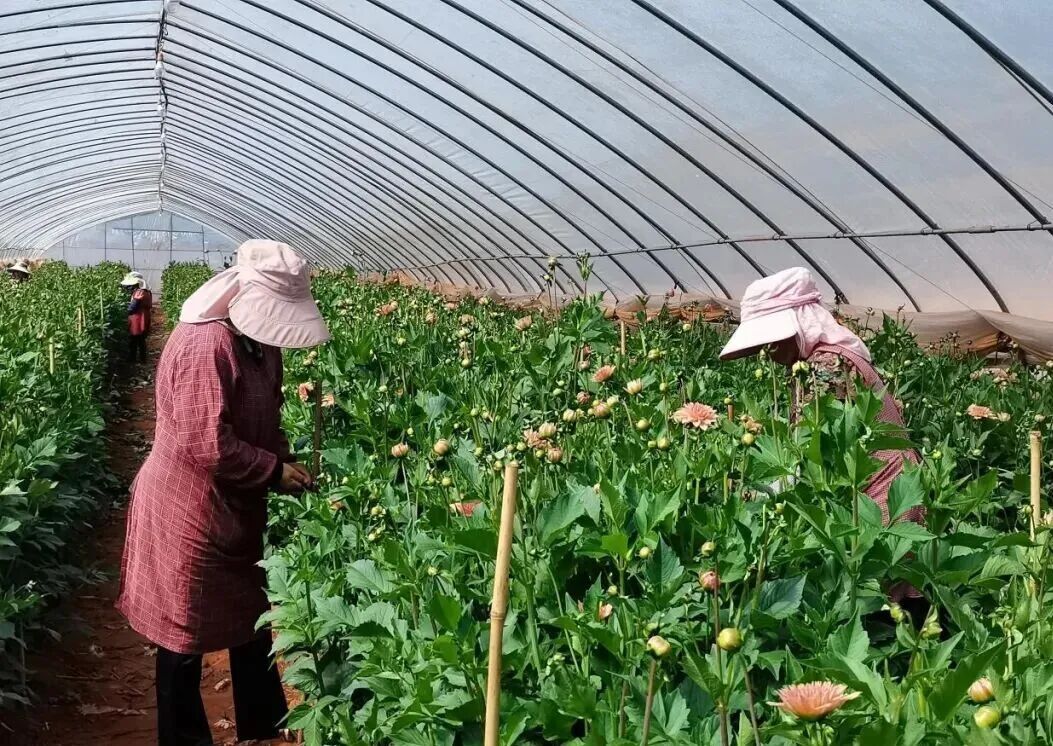 如今,寻甸县花卉产业规模持续壮大,2025年全县花卉园艺面积达1.65万亩,其中鲜切花1.40万亩,产量2.39亿枝,仅一产产值就达5.23亿元。草海子社区花卉基地已成为寻甸花卉产业规模化、标准化发展的核心样板,主要种植大丽花、大飞燕等高端品种,年产鲜切花1200万枝,综合产值3000万元,其大丽花、大飞燕的种植规模和品质稳居云南省前列,产品不仅直供上海及全国市场,还远销东南亚地区,2025年销往上海的销售额超过500万元。此外,2025年7月,该基地被认定为寻甸县就业帮扶车间,是全县41个就业帮扶车间中5个东西部协作援建车间之一。