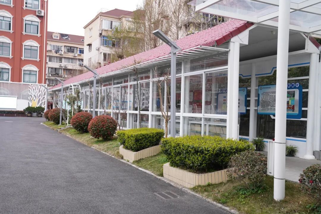 民办杨浦实验学校在校门与教学楼之间,打造了一条书香风雨长廊,让阅读风雨无阻