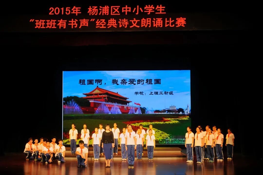 2015年,杨浦区首届“班班有书声”展演上,上海理工大学附属初级中学师生朗诵《祖国啊,我亲爱的祖国》