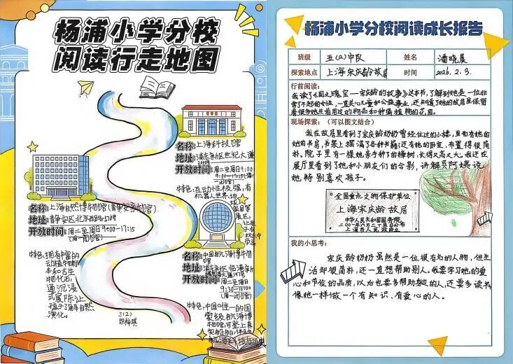 杨浦小学分校以阅读行走地图和阅读成长报告,将阅读场域延伸至大社区,融场馆坐标、本地文史与自然科普于一体,形成“阅读+行走”课程化导览