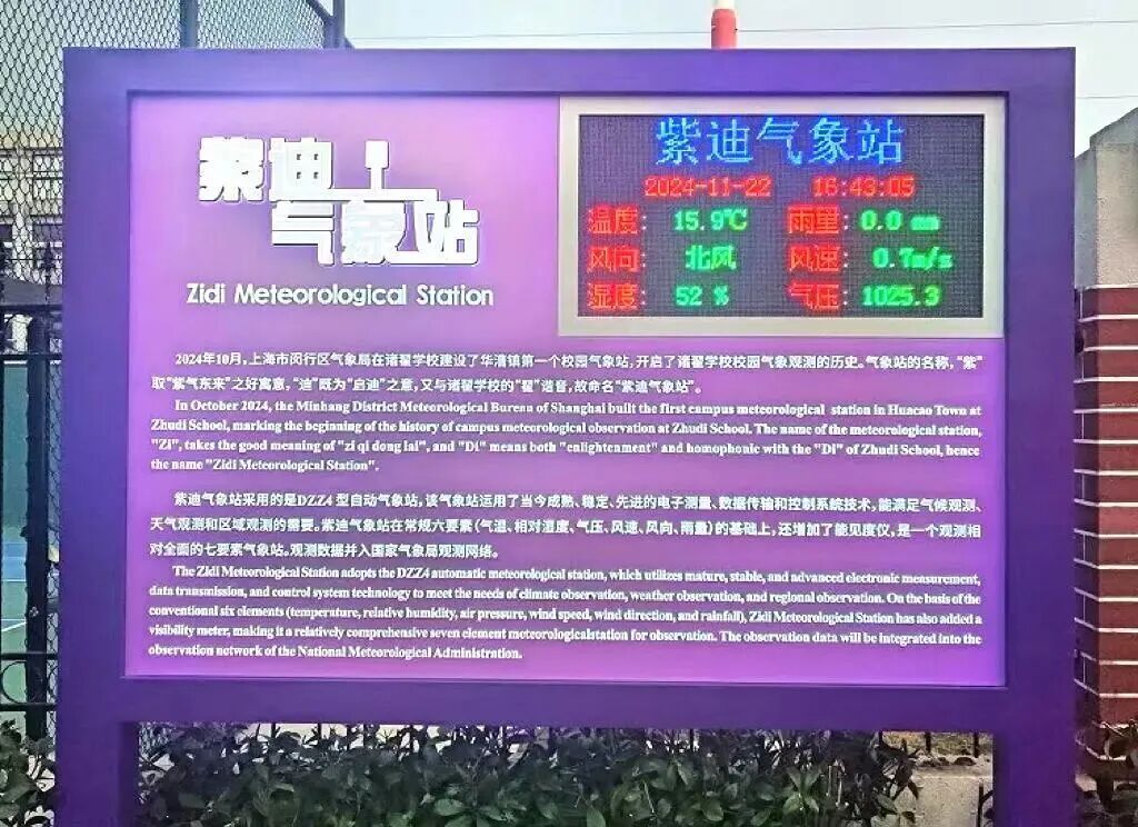 其中,“气象乐园”依托校内紫迪气象站,联动上海气象学会、闵行区气象局,深化气象科学探究。紫迪气象站建于2024年,是上海市气象局在华漕设立的首座校园气象站,配备八类专业观测设备,数据实时接入市气象平台。学生可参与气温、湿度、气压、风速等观测,并学习气象大数据、无人机气象应用、灾害预警等前沿内容,培养科创思维。