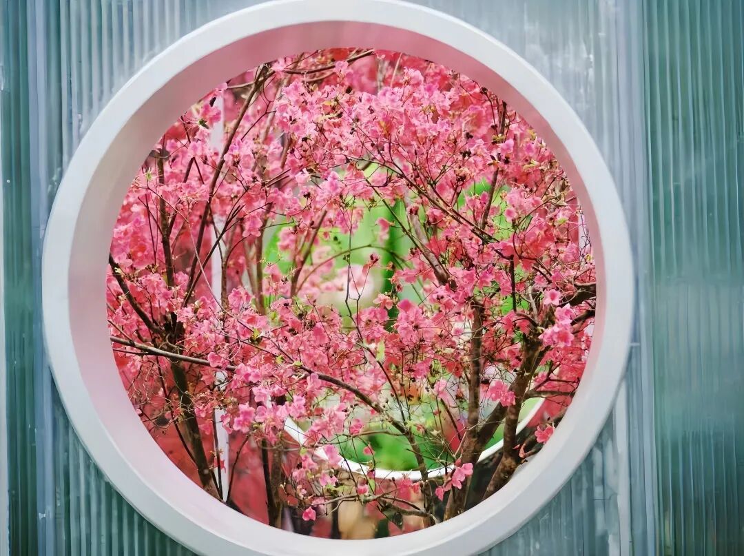 “一木千林”里,圆形花窗框住烂漫花枝,定格下春日满目温柔。