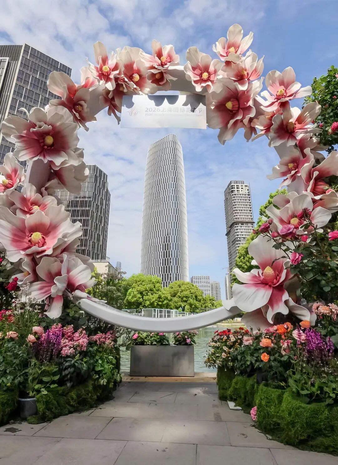 “三城之园”里,巨型花球缀满繁花,密密缠绕、灼灼盛放,盛满人间烂漫。
