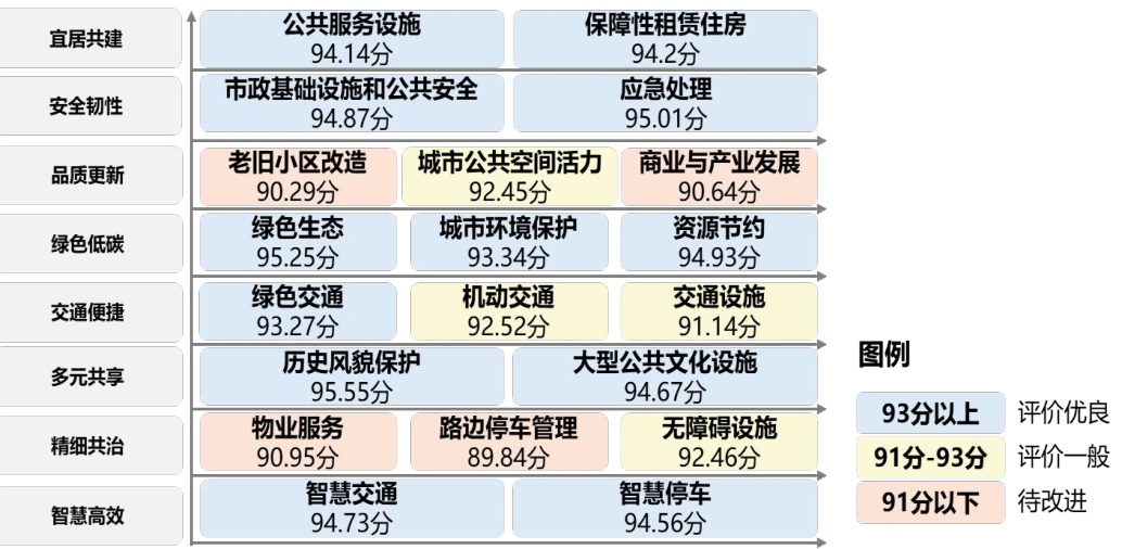 调研显示,市民满意度较高的领域主要集中在三个维度:一是安全韧性维度。市民对市政管网安全、消防安全、地下空间安全,以及排水防涝应急抢险和应急避难场所建设等评价较高。二是多元共享维度。市民对历史建筑保护活化,以及图书馆、城市书屋、博物馆、科技馆、美术馆、展览馆、剧院等文化设施满意度较高。三是绿色低碳维度。市民对城市公园绿化、城市慢行绿道、市政道路绿化、生活垃圾分类和公共建筑绿色节能等方面认可度较高。