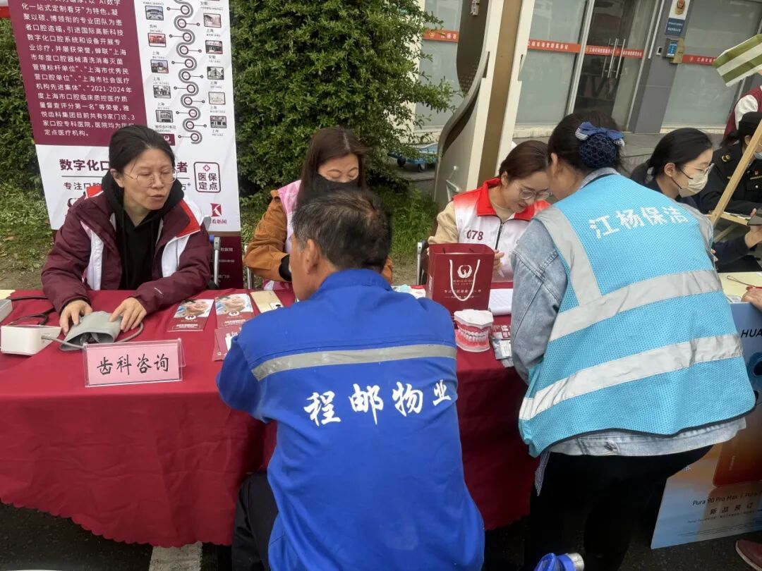 健康咨询区,杨行镇社区卫生中心的医生忙着量血压、测血糖、问诊;齿科咨询摊位前,一位蔬菜批发商户捂着腮帮子坐下:“平时忙得脚不沾地,哪顾得上牙疼,没想到逛市场还能顺便看牙。”