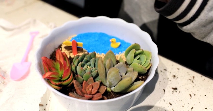 随后,在讲解员的指导下,学生们学习多肉植物的种植方法,从铺设营养土到栽种摆放,一步步完成自己的“微型生态”。