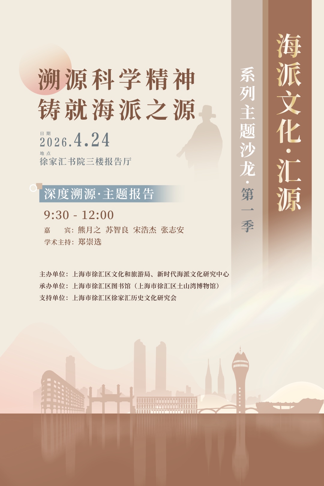 4月24日,“海派文化·汇源”系列主题沙龙将在徐家汇书院举行,邀请学界专家共聚一堂,探讨从徐光启“会通超胜”思想到现代海派文化形成的历史脉络,探索海派文化之源传承创新。