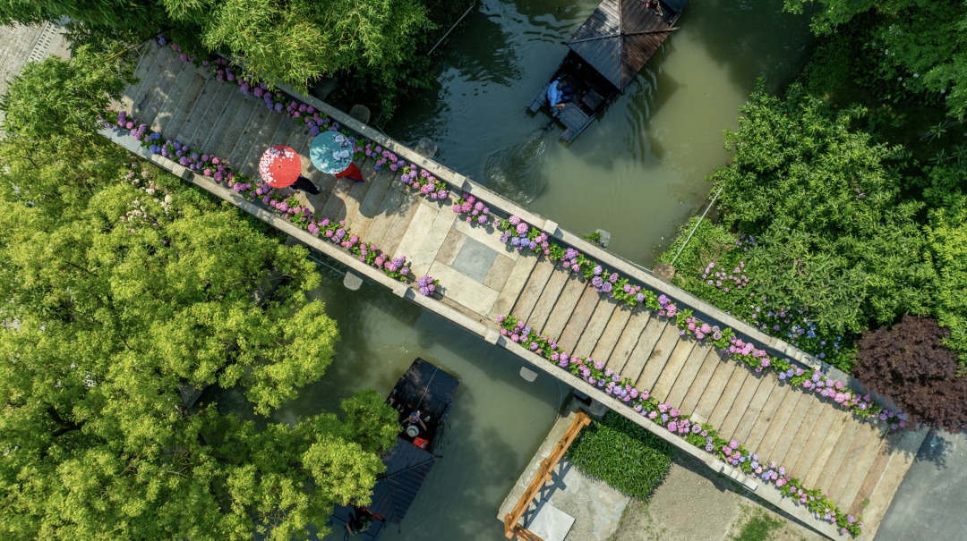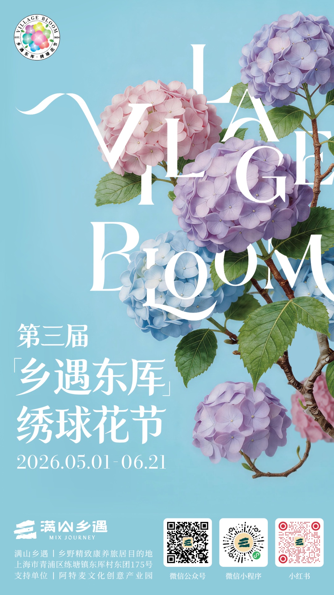 一朵花,带火一个村。2024年夏天,练塘镇东厍村浪漫绚丽的绣球花瀑布在小红书等各大社交平台上火速出圈,两届「乡遇东厍·绣球花节」迎接了超十万人次的探访,开启沪派乡村生活美学新范式。 四月的春风漫过东厍村的溪岸、田埂与古桥石纹,绣球花顺着乡野的肌理,次第舒展盛放开来。Village Bloom,是花的自在绽放,是村落的温柔生长,也是人生每一段时光都能随心出彩的礼赞。 承两载陪伴之暖,赴一场花事之约。2026第三届「乡遇东厍·绣球花节」,将于5月1日至6月21日诗意绽放!沪派江南的乡村温婉,邂逅草原游牧的自在风情,花境昼夜双景“花好月圆”,勾勒出沉浸式赏花的浪漫意境。 “锦花・艺、吟花・乐、沁花・食、栖花・营、繁花・集”五大乡野体验,将美学、艺术、烟火与自然相融,食住行游购娱皆藏诗意,视觉盛景、乡野旅居、人文雅趣尽数囊括。所有美好,都揉进这一季花期里,赏花海,栖乡野,自在就好。