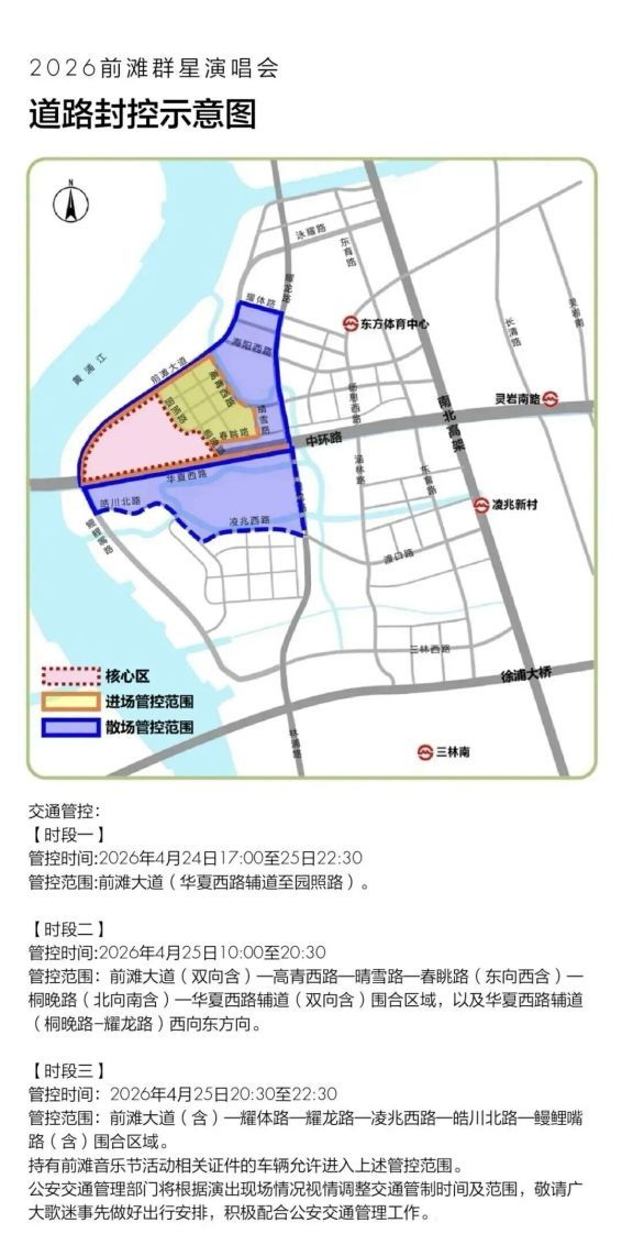 “星花怒放 同忆首歌——前滩群星演唱会”将于2026年4月25日在前滩体育公园举行。为确保演出活动安全、顺利举办,根据《中华人民共和国道路交通安全法》的有关规定,对部分道路采取临时交通管制措施。现通告如下: