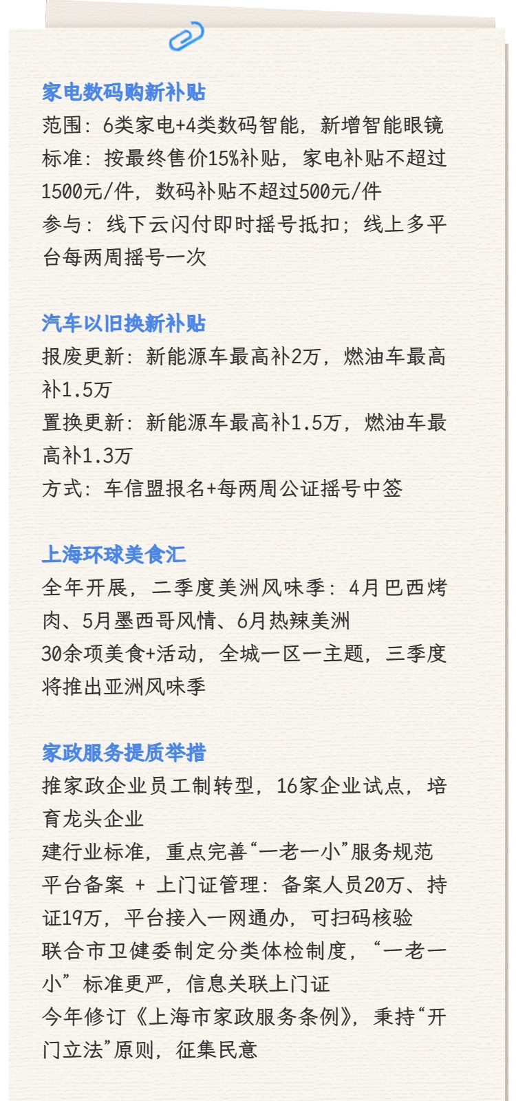 家电数码产品购新补贴与汽车以旧换新补贴具体政策是什么?“上海环球美食汇活动”有哪些具体规划和特色亮点?上海将如何完善家政服务业,满足市民多样化的需求?这些内容与市民生活密切相关↓