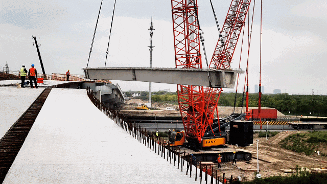 现场可以看到,吊装区域警戒线内,指挥员、操作手、安全员各司其职。在450吨重型吊机的轰鸣声中,长31米、重130吨的混凝土箱梁被缓缓吊起,地面人员根据实时测量数据,通过引导绳微调角度。不到30分钟,箱梁底部的预埋件与桥墩支座上的螺栓孔完美契合,整个过程一气呵成。