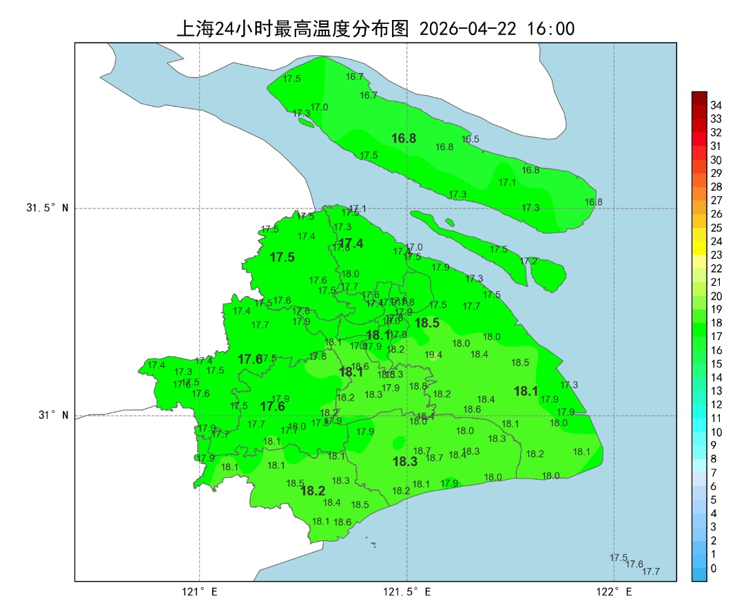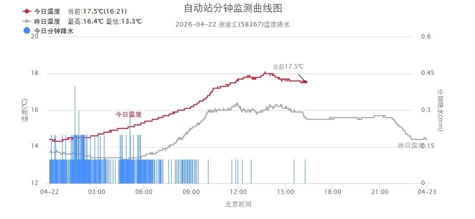 今日回顾 受切变线东移影响,申城昨夜普降中到大雨,今天白天雨势减弱。统计22日08时~16时显示,全市累积雨量为小雨量级。雨水影响下,今天最高气温多在17、18度附近,市区徐家汇站18.1度,加之风力不小,白天体感有点凉飕飕。 今夜明日天气 申城今天夜里阴有时有阵雨,明天雨势进一步减弱,阴到多云有短时小雨,下午转多云到阴,偏北风4~5级,相对湿度95%~65%,气温在13~16度,体感偏凉,及时添衣。 未来天气趋势 周五至下周一申城晴或多云天气为主,阳光助力下,最高气温在23~26度,最低气温13~17度,昼夜温差拉大,“洋葱式”穿搭又派上用场了,方便随时增减衣物,谨防感冒。下周二起云系增多,申城又多降水天气过程,气温随之回落。 明日天气 未来几日天气 4月24日(周五):晴到多云转多云,13~23度 4月25日(周六):多云到晴,14~23度 4月26日(周日):晴到多云转多云,15~26度 4月27日(周一):阴到多云转多云,17~26度 资料:市气象服务中心、上海发布 编辑:沈悦 点击下方了解更多 “每一条都能对到我们业务上”——普陀数商企业扎堆海纳小镇,听专家拆解数据变现密码 普陀内环旁一地块出让 汇集上百家原创店铺,喜欢手账的你千万别错过普陀这个集市! 适老化也能很时尚!普陀托客乐思样板间亮相,解锁居家养老新美好 痛点直接说、方案现场谈!普陀这场网安市集太实用