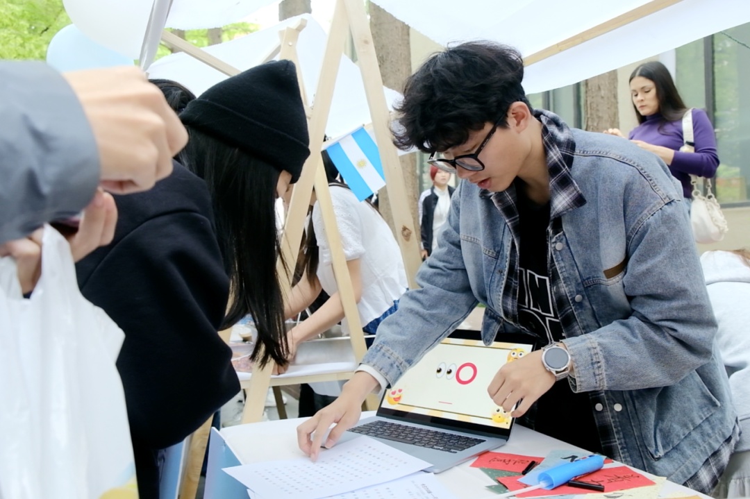 正值国际中文日,本届国际美食嘉年华也特别设立了中华文化与美食体验专区,其中的各项活动也成为国际学生了解中文、感知中国文化的绝佳窗口。今年的中国展台以汉字为核心,通过书法体验、甲骨文识读等特色体验,让国际学生在动手实践、趣味互动中,直观感受汉字的演变脉络与独特魅力,在轻松的体验中走近中文、了解中文背后的文化内涵。国际文化交流学院研究生会执行主席蔡睿吟(中国)表示:“中华美食与文化体验专区,是我们面向国际学子传播中华优秀传统文化、讲好中国故事的重要窗口。我们依托美食体验与传统民俗互动,生动展现中华文化的精巧意趣与人文底蕴。在现场我也看到,金融学院的展台带来了极具特色的甲骨文识读游戏,让国际学生在趣味游戏中感受汉字演变与文字之美,使他们能够走近并理解中华传统文化。”