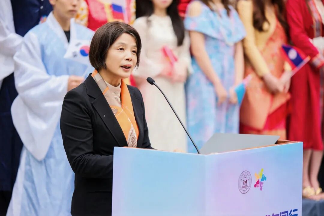 姚玲珍副校长致辞并宣布本届国际文化节开幕。她结合本届文化节 “数智无界,青年同行” 主题,寄语上财中外学子勇立数智潮头,以技术为翼、以文化为魂,在构建人类命运共同体的实践中,当好中国故事的传播者、文明互鉴的引路人。