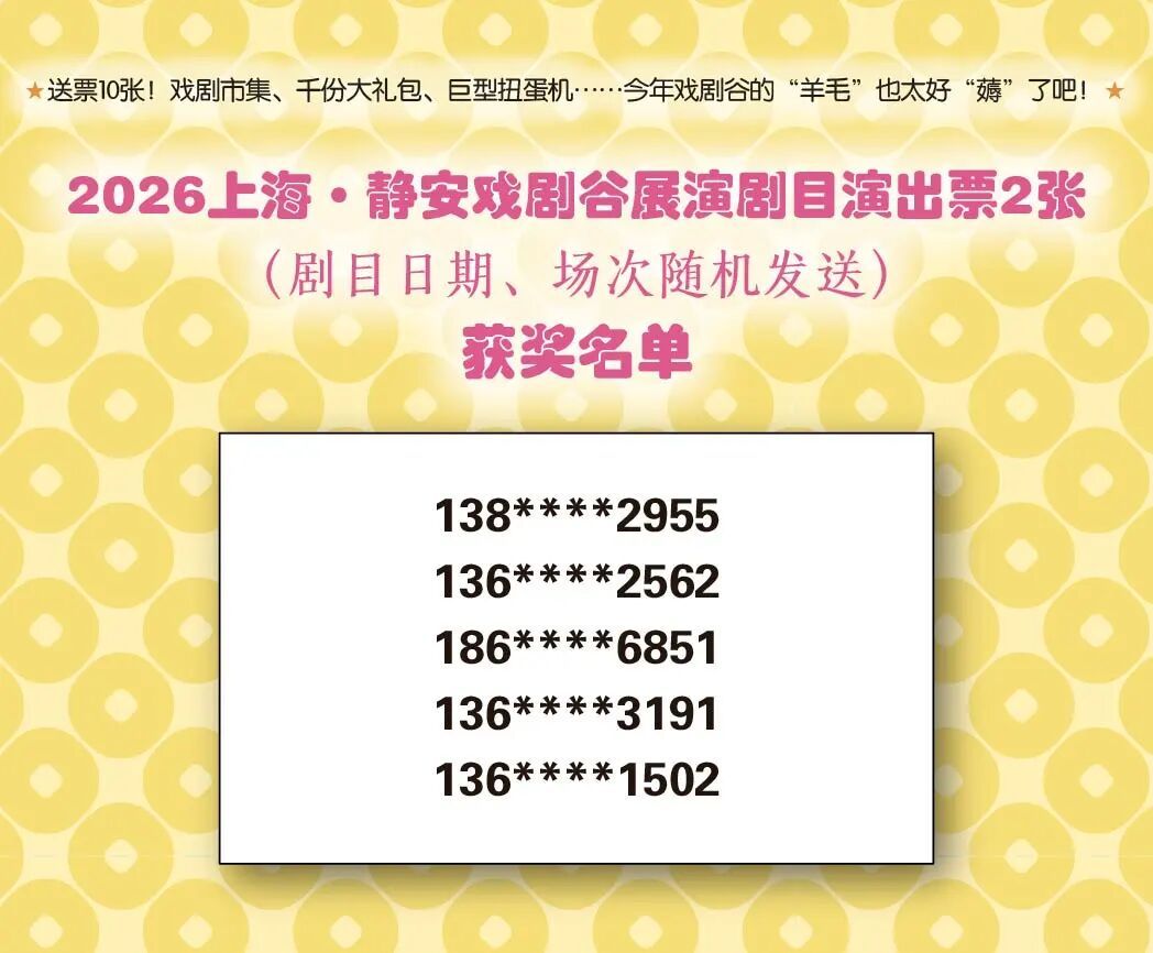 此前静宝推送的《送票10张!戏剧市集、千份大礼包、巨型扭蛋机……今年戏剧谷的“羊毛”也太好“薅”了吧!》中奖名单已经出炉!详见↓