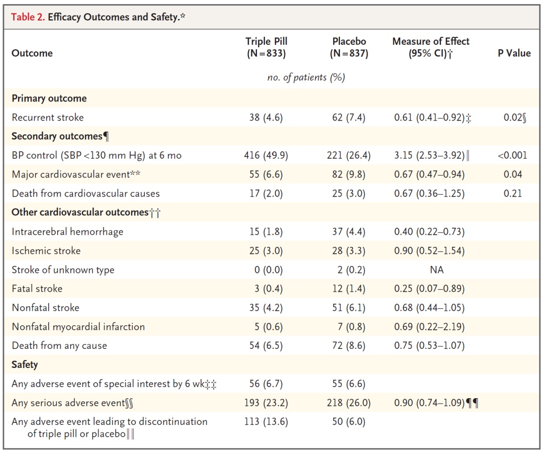 研究主要结局,三联降压药可使卒中复发率下降39%