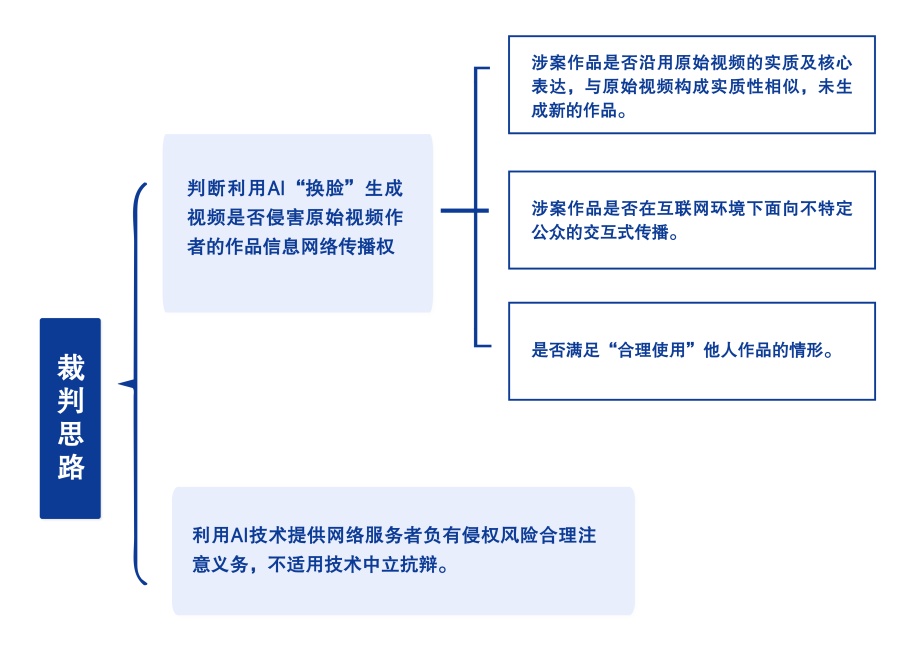本案中,原告作品的核心价值在于表现古风服饰妆造、姿势动作以及场景设计等,而非所拍摄人物的面部特征。被告利用AI技术将原始作品素材分解后,根据算法重新组合,实现对原始作品面部形象的局部替换,目的是通过“去人脸化”形成可以规模化统一应用的换脸视频模板,借此牟取商业利益。“AI换脸”所生成的视频实质性再现了原始作品的具体表达,没有改变原始作品的功能和价值,对原始作品产生替代性效果并影响其潜在市场价值,损害原告的合法利益。据此,被告的合理使用抗辩不能成立,其行为构成侵害作品信息网络传播权。