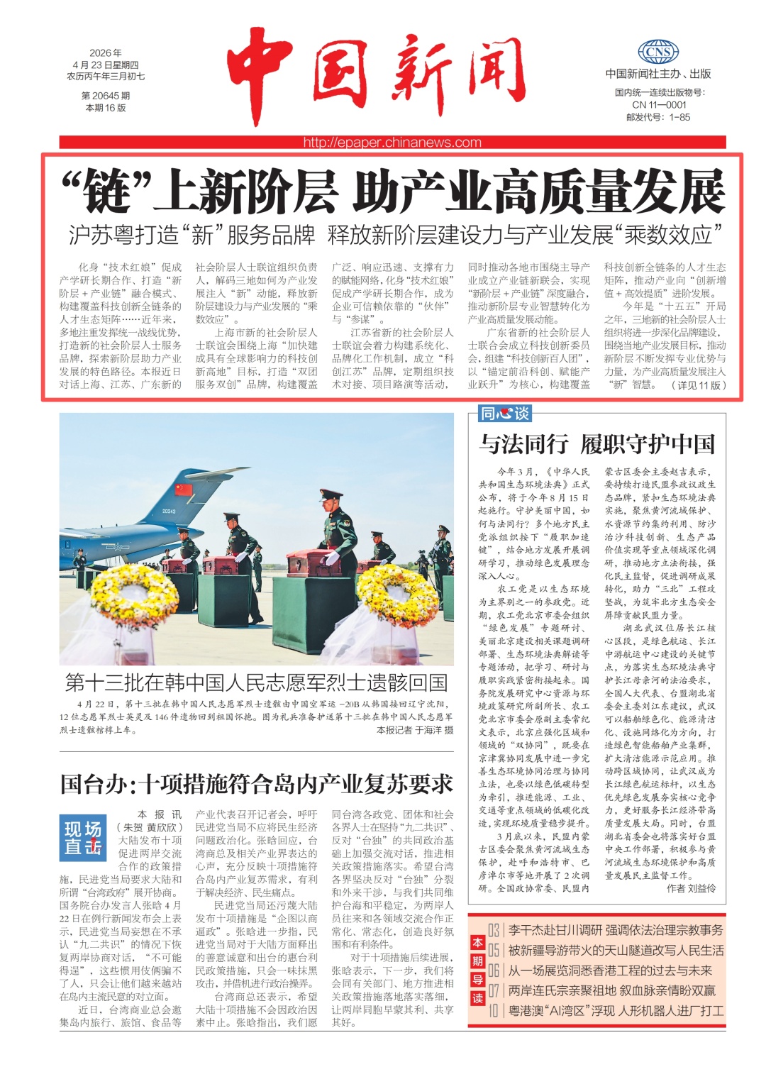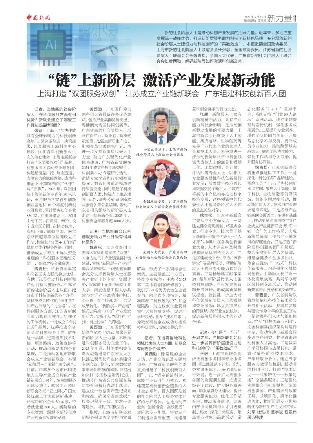 2026年4月23日,《中国新闻》报头版头条刊发专题报道《“链”上新阶层 助产业高质量发展——沪苏粤打造“新”服务品牌 释放新阶层建设力与产业发展“乘数效应”》,专访全国政协委员、上海市新的社会阶层人士联谊会会长张毅,全国政协委员、江苏省新的社会阶层人士联谊会会长魏青松,全国人大代表、广东省新的社会阶层人士联合会会长黄西勤,共同解码新阶层如何激活科创新动能。