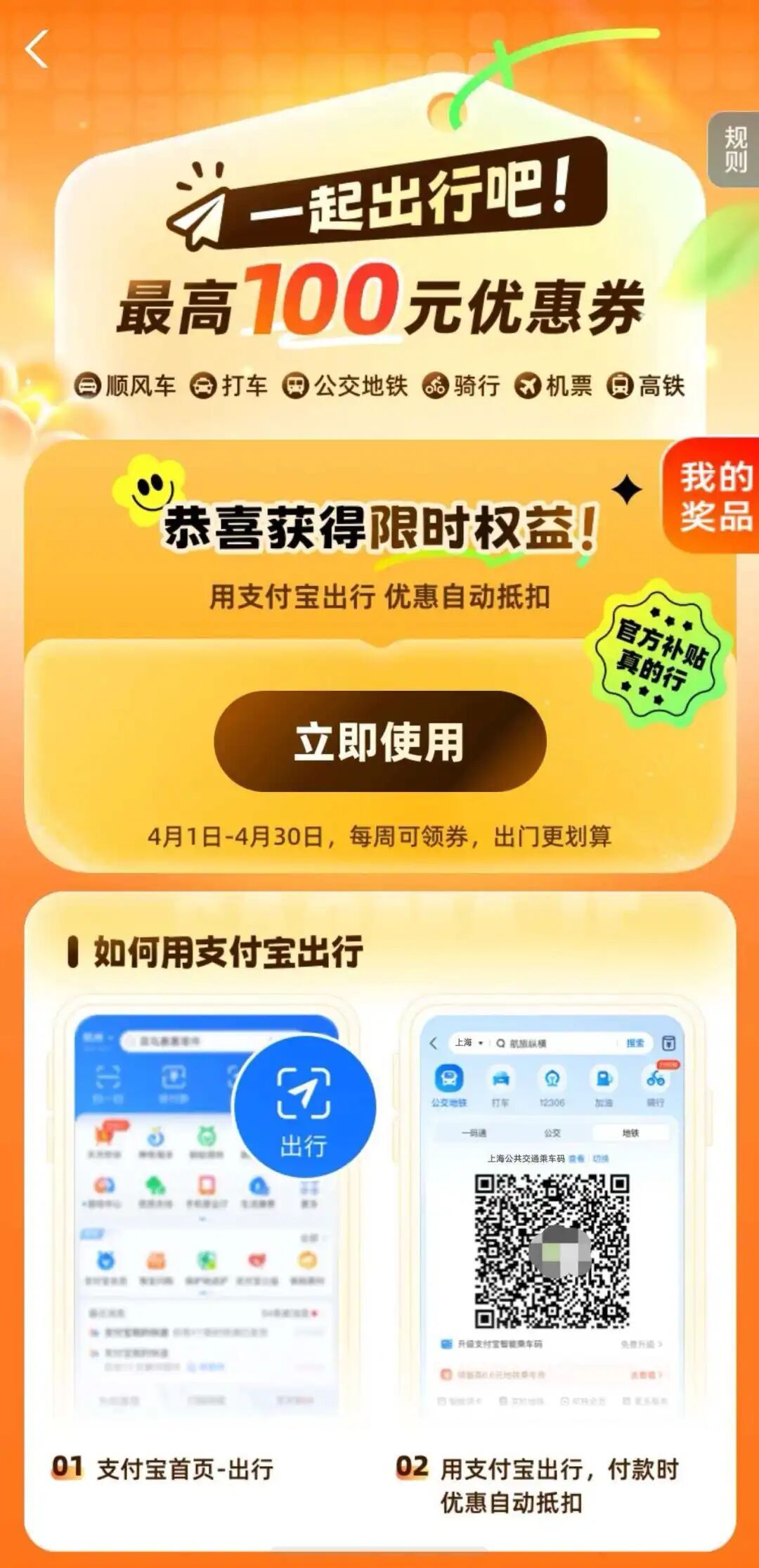 上支付宝App搜索“一起出行吧”,即可进入活动页面领取最高价值100元的出行优惠券包。无论是乘地铁去公园、骑共享单车兜风,还是打车、坐高铁去周边赏花,付款时优惠都会自动抵扣。