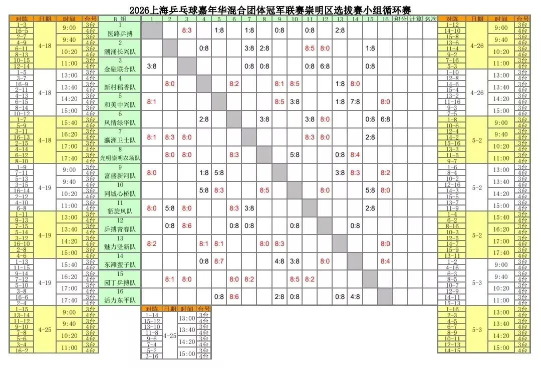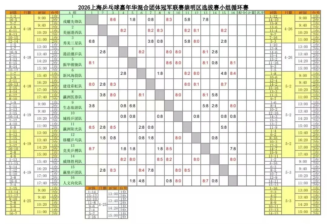 “爱乒才会赢,乐享嘉年华!”2026上海乒乓球嘉年华混合团体冠军联赛“上海农商银行杯”崇明区选拔赛首站,于4月18-19日在崇明M515开打。方寸球台之上,各支队伍挥拍竞技、以球会友,无论是经验丰富的老将,还是初出茅庐的新秀,都以满腔激情与顽强拼搏诠释乒乓魅力。每一次精准的回球、每一次奋力的扣杀,都赢得现场观众的热烈掌声。 在4月18-19日的赛程里,96场六轮对决轮番上演,每一局都扣人心弦、悬念迭起,赛场内外人潮涌动,欢呼声不断。 经过多轮激烈角逐 首站赛事各组别成绩如下 下一站 4月25-26日 我们相约长兴岛郊野公园 参赛观赛的同时 还有花海美景、亲子活动等丰富内容 敬请期待 4月25-26日,长兴岛郊野公园3号门军体教研室,专业场地、规范赛制,全城高手齐聚,以球会友,挥拍竞逐。 赛事期间,长兴岛郊野公园将为参赛选手免费提供矿泉水与比赛专用乒乓球,全力护航每一场精彩对决。 春日海岛风光正好,参赛观赛之余,长兴岛郊野公园繁花似锦、风光旖旎,鸢尾园、玫瑰园即将迎来盛花期,法式花墙、热气球装置、网红花海打卡点全面开放,一步一景氛围感拉满,沉浸式花海美景随手出圈。 2026“郊野小勇士・亲子嘉年华” 勇士障碍赛也即将重磅来袭,趣味闯关、亲子协作、勇气挑战,让大小朋友在自然郊野间尽情释放活力,共度温馨欢乐时光。 “五一”假期,公园还将推出水稻插秧、果蔬采摘、儿童爱心义卖集市等特色活动,花事、赛事、农事三大主题联动融合,一站式解锁崇明春日休闲欢乐。 收好这份竞赛日程 别错过每一场精彩赛事哦 资料:区体育局、长兴岛郊野公园 编辑:焦倩倩