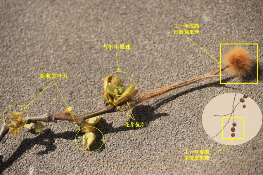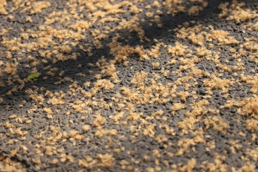 悬铃木果实是由多数的小坚果集合成球形的聚花果,小坚果基部围有长绒毛,俗称为果毛。每年3-4月悬铃木新叶生长,往年成熟的果球开裂、脱落,大量果毛从树上飘落,形成“毛毛雨”,是植物正常的生理现象。
