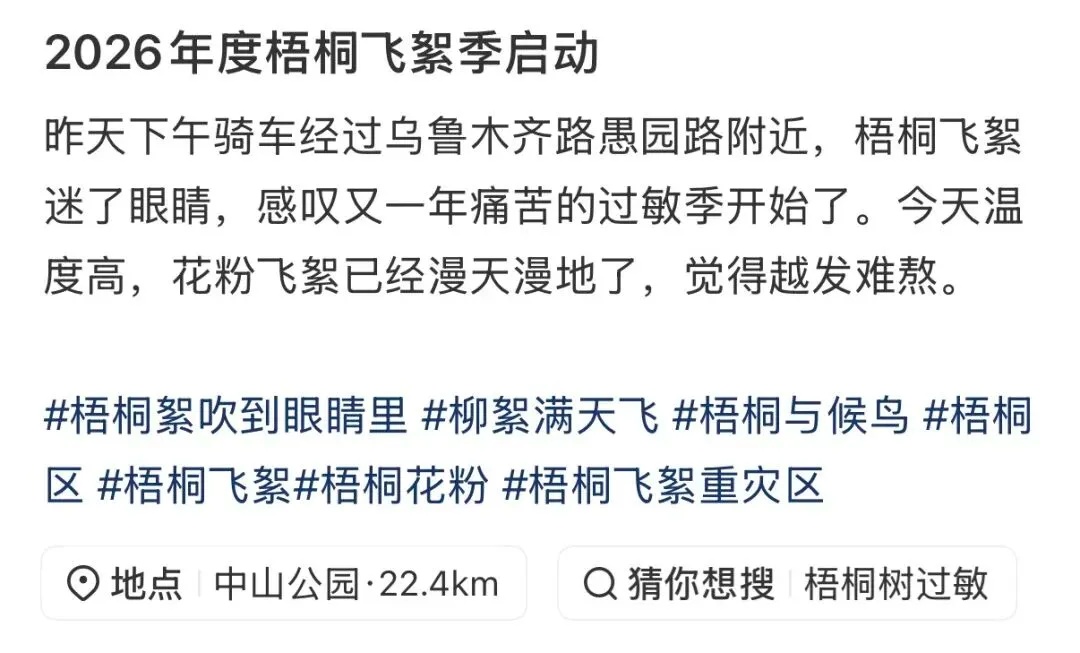 根据近期气象预报显示,4月中旬开始,本市主要以晴朗多云天气为主,气温达20℃以上。在风力作用下,届时可能迎来悬铃木果毛集中飘落期。预计4月底,果毛飘絮达到峰值,5月中下旬基本结束。