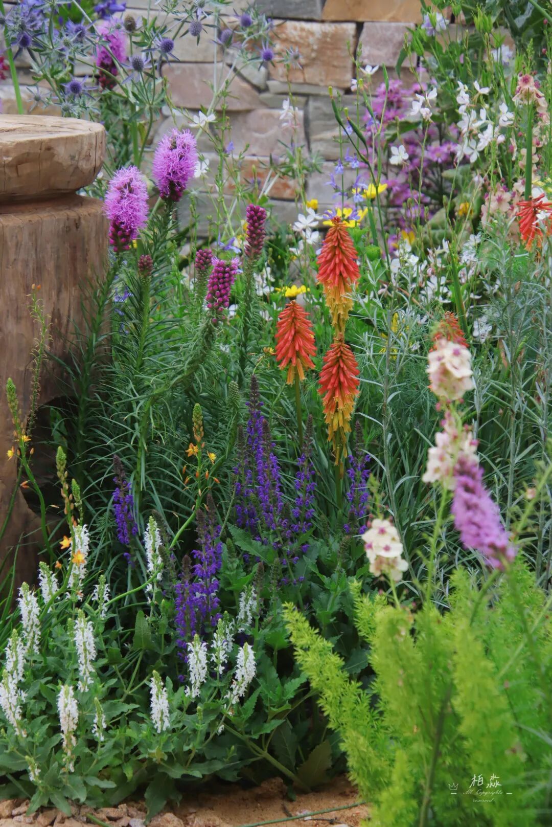 还有原产南非的火炬花(火把莲),作为岩石花园经典线条植物,它耐旱性极强,花序高挺、色彩亮丽,傍晚时分在花园中如升腾的火焰,成为夜色中最亮眼的存在。鬼切芦荟、南非勋章菊等南非常用园艺物种错落生长,搭配蓝剑柏、百子莲等植物,构建出层次丰富的低维护生态花境。