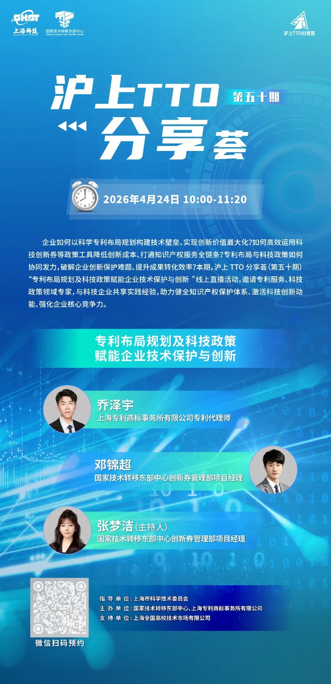 企业如何以科学专利布局规划构建技术壁垒、实现创新价值最大化?如何高效运用科技创新券等政策工具降低创新成本、打通知识产权服务全链条?专利布局与科技政策如何协同发力,破解企业创新保护难题、提升成果转化效率?4月24日10:00,国家技术转移东部中心将主办沪上 TTO 分享荟(第五十期)“专利布局规划及科技政策赋能企业技术保护与创新 ”线上直播活动,邀请专利服务、科技政策领域专家,与科技企业共享实践经验,助力健全知识产权保护体系、激活科技创新动能、强化企业核心竞争力。