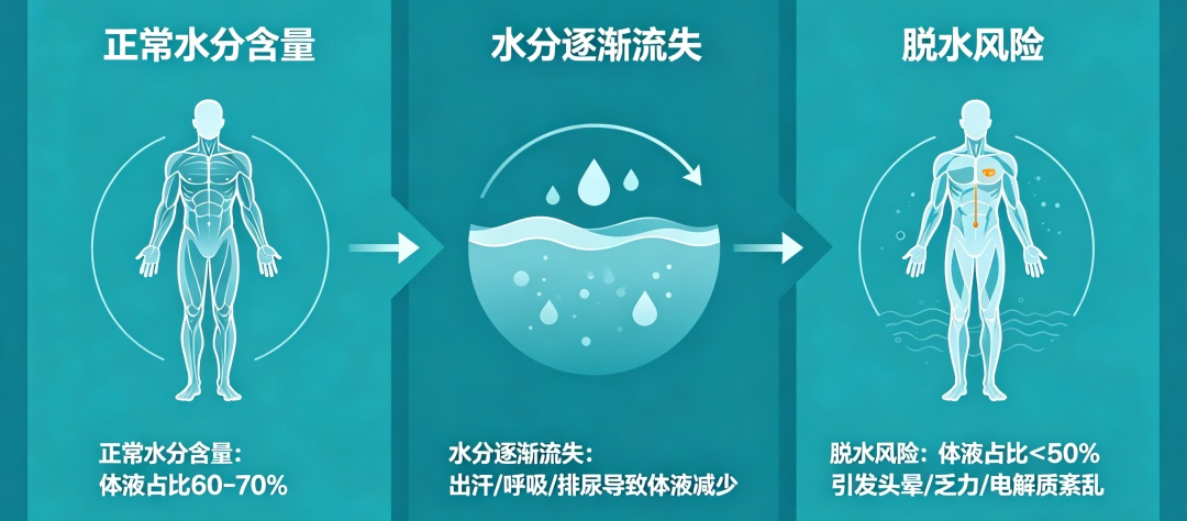 脱水表现:口干、眼窝凹、皮肤干、尿量极少 / 尿色深黄