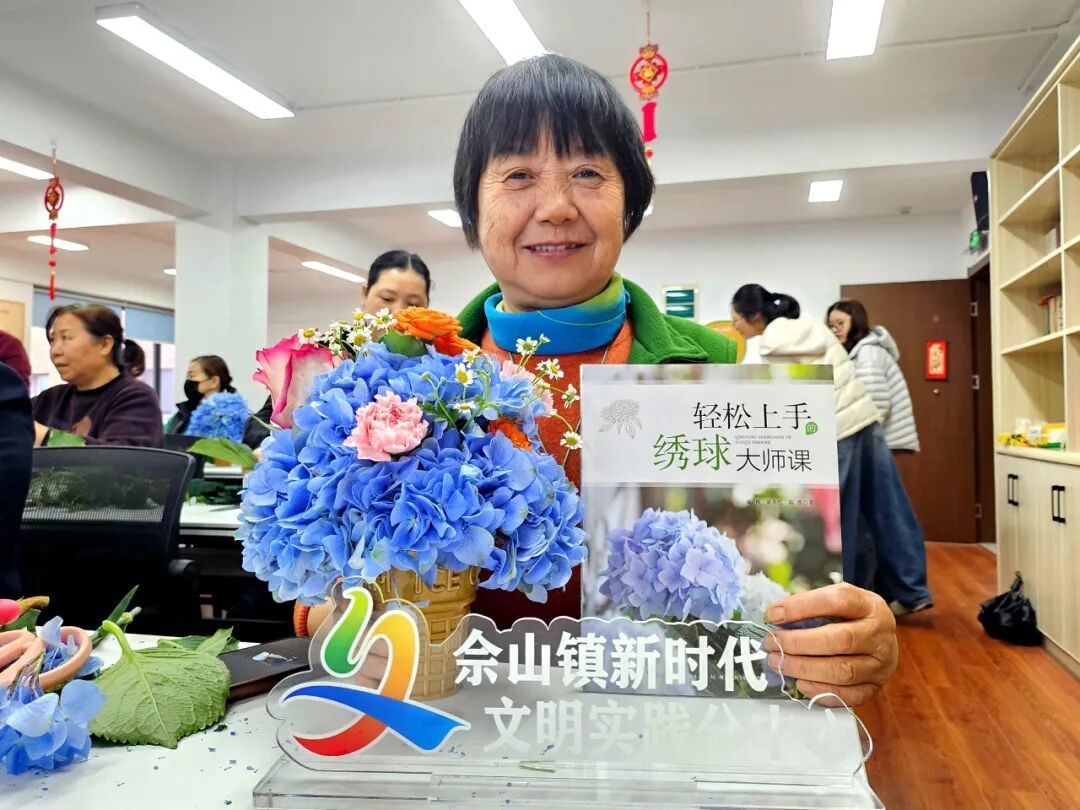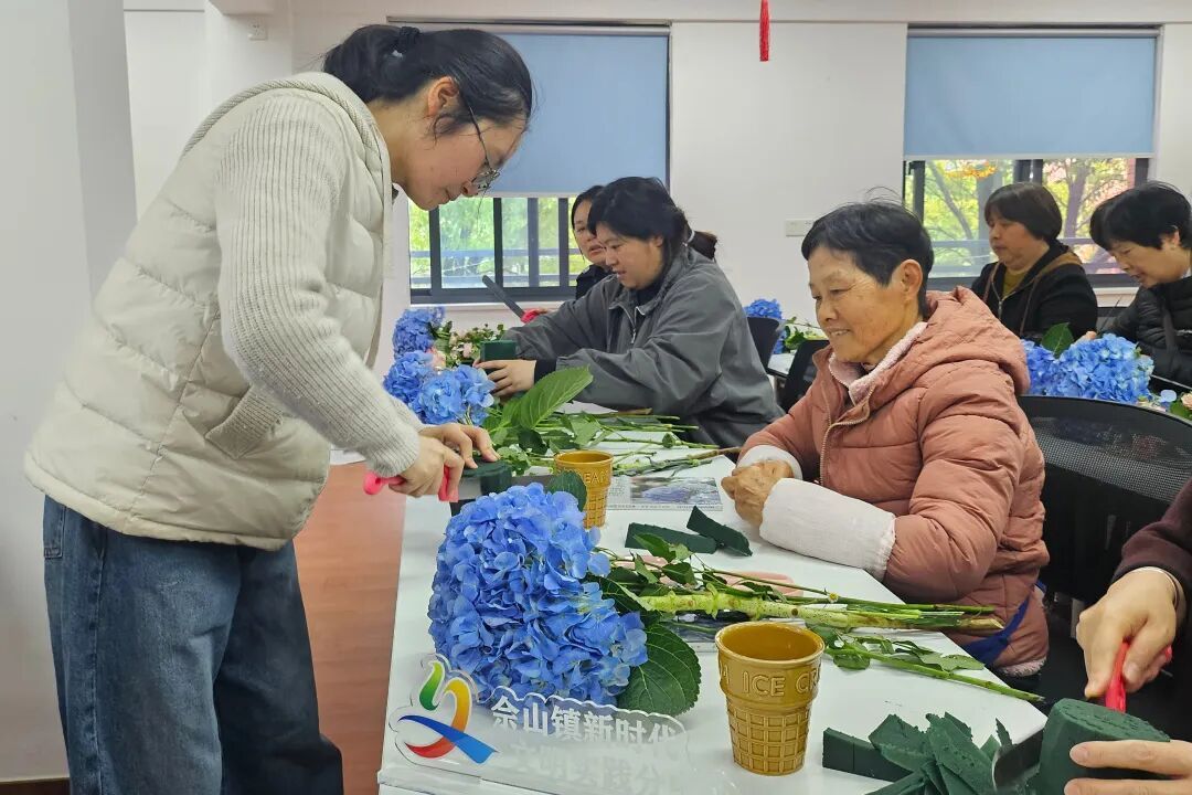 最后的“创意插花乐”环节,在杨君老师的指导下,居民们将绣球花与配花巧妙搭配,从花材选择、枝叶修剪到色彩搭配、造型设计,亲手制作出风格各异的插花作品。