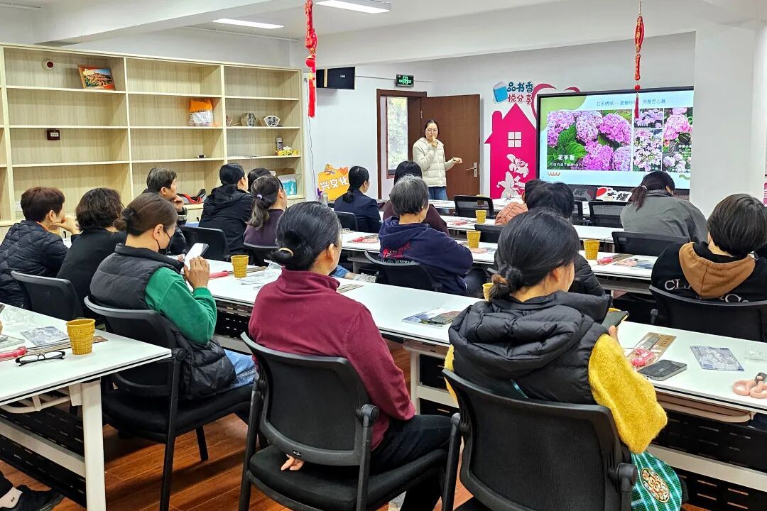 本次活动特别邀请上海辰山植物园工程师杨君走进社区,为居民带来一场生动的“园艺小课堂”。杨君围绕绣球花养护,系统讲解家庭养花的常见误区和科学方法,还现场演示了扦插繁殖的操作步骤。