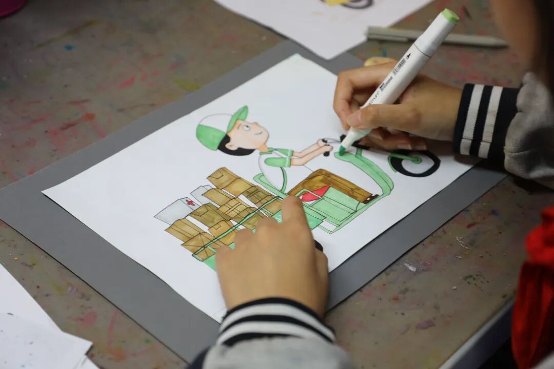 在绘画环节中,孩子们拿起画笔,在画纸上尽情挥洒。有的托着腮帮认真构思,有的边画边和同伴交流,画室里充满了铅笔的沙沙声和轻声的讨论声。不一会儿,一幅幅生动的作品便跃然纸上。孩子们把画作小心翼翼地贴在慰问品的包装上。这些画作色彩鲜艳、充满童趣,有的画着穿着超人披风的快递员,有的画着风雨中依然微笑配送的外卖小哥,还有的写满了“谢谢您”“辛苦了”等稚嫩而真诚的祝福语。