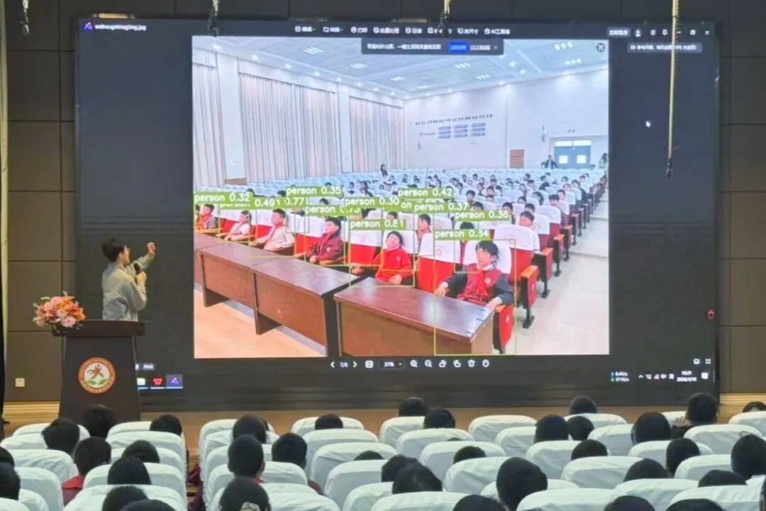 讲师们在讲解中穿插有趣的代码演示、活泼的互动提问,充分调动起学生们的积极性。在代码演示中,讲师现场拍摄学生合照,实时操作代码,展示AI如何辨别出人物与桌椅等不同要素,让学生们身临其境地感受AI的工作逻辑。