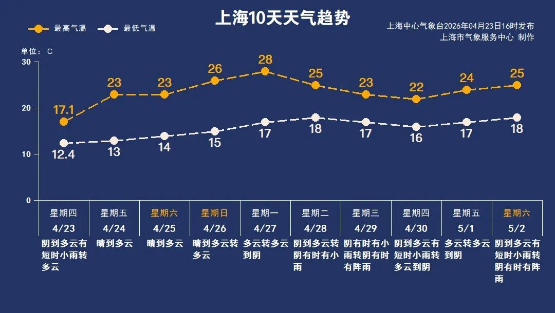 本周末至下周一,阳光热情放送,气温一路爬升,周一达到28℃左右,是近期顶点,大家抓住出行、洗晒好时机,尽情享受春天!昼夜温差较大,建议使用洋葱穿衣法。下周二起,大气环流调整,本市又将出现一段阴阴雨雨的天气,气温小幅回落。春季天气变化较快,请大家随时关注预报信息。