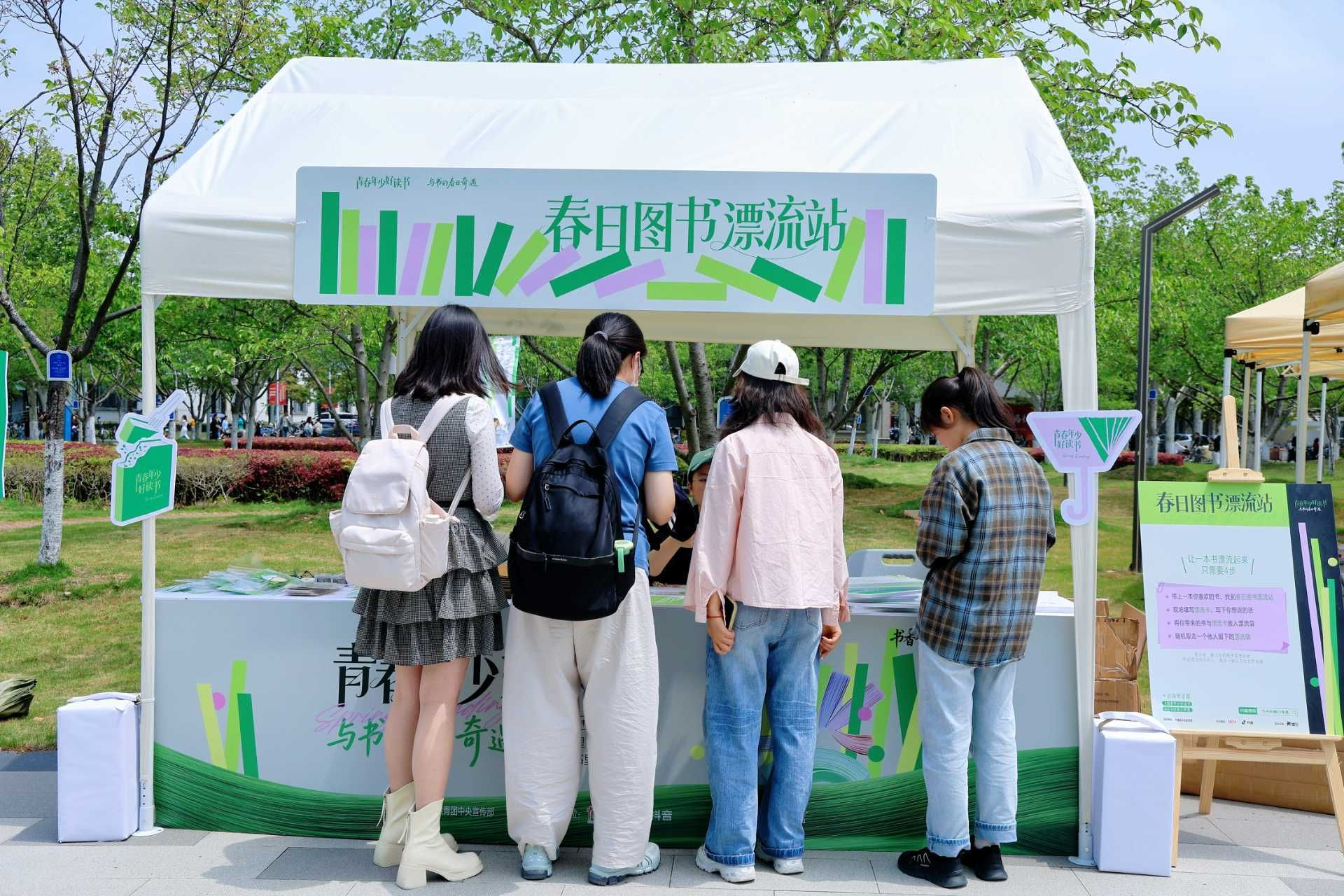 学校还在校园公共空间设置了多个开放式春日读书点,让同学们“在校园里自在阅读”,并打造线上+线下结合的书香传播方式,鼓励师生制作荐书短视频、阅读Vlog……在抖音平台分享“漂流”体验,将阅读故事在线记录与传播。