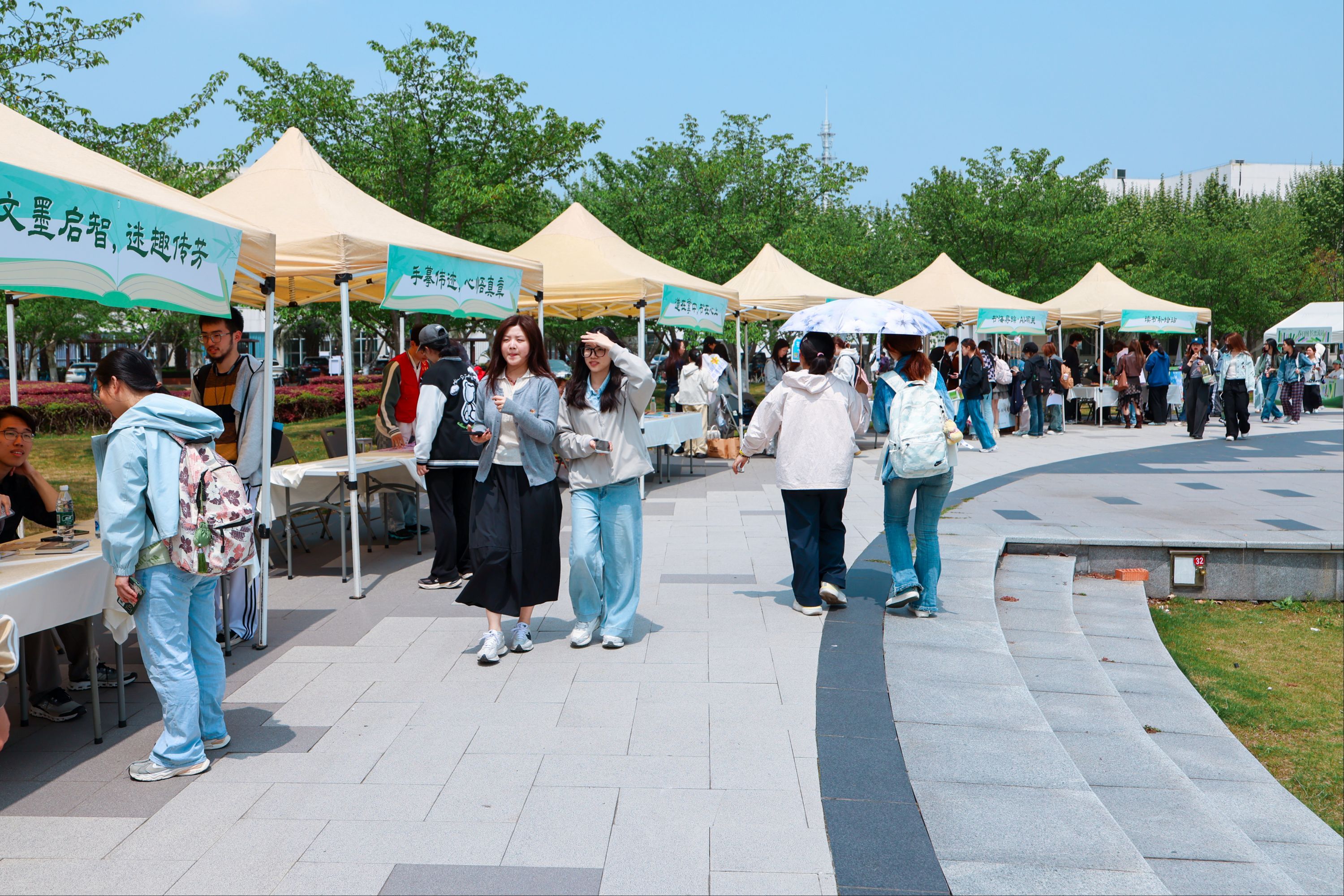 现场人潮涌动,同学们在春日校园里迎来一场以书为媒的温暖邂逅。摊位前,既有各学院结合专业特色精心筹备的特色书籍,兼具知识性与专业性;也有图书馆重磅推出的“中外文图书展”,搭配大型数字资源阅读推广活动,为师生带来沉浸式阅读体验。拾柒棉共创中心摊位创新推出“三本书换一杯咖啡”活动,京东、中文在线等知名文化平台也惊喜亮相。