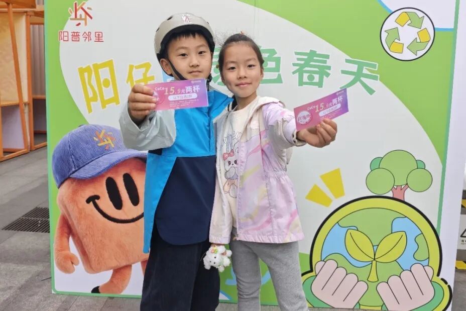 市集现场,阳普邻里的专属IP“阳仔”化身最萌“向导”,其温暖治愈的形象遍布海报与打卡墙。除了跳蚤市场,主办方杨商投还巧妙植入了商业互动环节:现场设置了“阳仔的绿色春天”快乐大转盘,孩子们争相排队答题转盘,赢取商铺优惠券;在主题墙前拍照打卡的家庭,还能兑换到实实在在的奶茶福利。