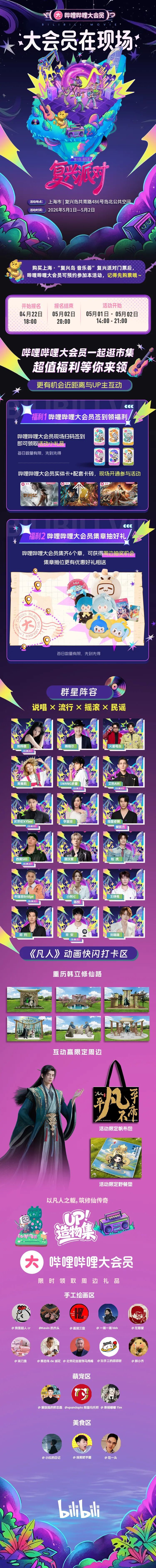“五一”假期 一起上岛,一起撒欢 B站来送福利啦! 这个“五一”, 复兴岛搭起一片线下“快乐基地”。 5月1日-5月2日, 哔哩哔哩“复兴岛·音乐荟” 复兴派对火热登岛, 两天音乐舞台,超强卡司齐聚, 从白天唱到夜晚, 腾格尔、郑钧、王铮亮、 艾热AIR等艺人都将来到现场, 用歌曲把积攒的烦恼清空。 你熟悉的“老朋友”UP主 将会在现场摆摊、唠嗑、发周边、 带你一起DIY、拍vlog素材, 还有《凡人》动画快闪打卡区 和“凡人”限定周边, 等你一起上岛撒欢! 同时,B站为大家 准备了大会员专属小礼品! 不仅有 哔哩哔哩大会员实体卡+配套卡砖 还可以集章抽好礼 限时领取周边礼品 (文末送福利!一定要看到最后哦) @哔哩哔哩大会员们 上海·“复兴岛 音乐荟”复兴派对 门票99元起 购买门票后可预约参加本活动 记得先购票哦 5月1日-5月2日 来复兴岛,一起逛市集 超值福利等你来领 ↓↓↓ 福利时间 ! 活动规则: 1. 关注“上海杨浦”微信公众号,购票+转发本条动态,即有机会获得哔哩哔哩大会员月卡; 售票渠道:【大麦】哔哩哔哩“复兴岛·音乐荟”复兴派对 2. 截图私信发送至公众号后台(注:需发送购票订单+转发动态2张截图),并回复“哔哩哔哩大会员+姓名+联系方式+联系地址”; 3. 我们将随机抽取100位幸运粉丝,每位赠送哔哩哔哩大会员月卡1份; 4. 截止时间:4月25日18:00,我们将通过私信通知获奖粉丝福利领取方式,请注意及时查收信息。