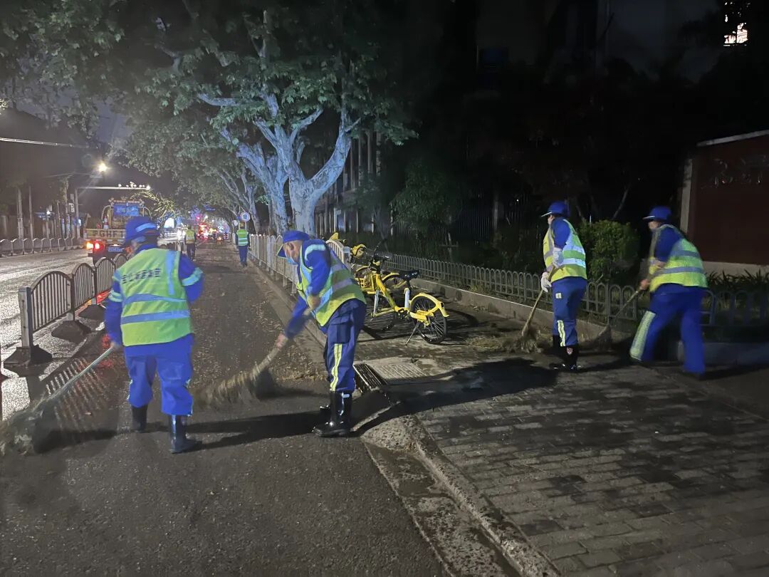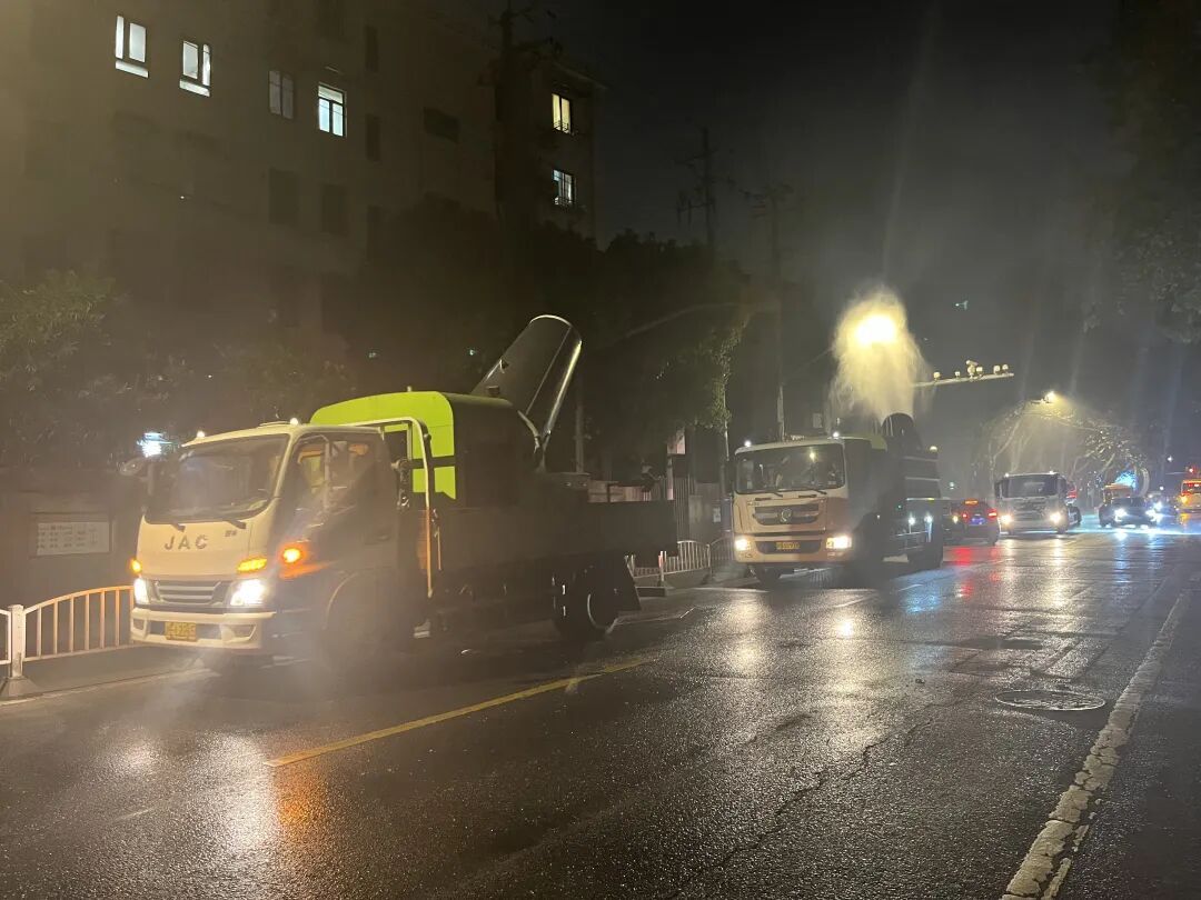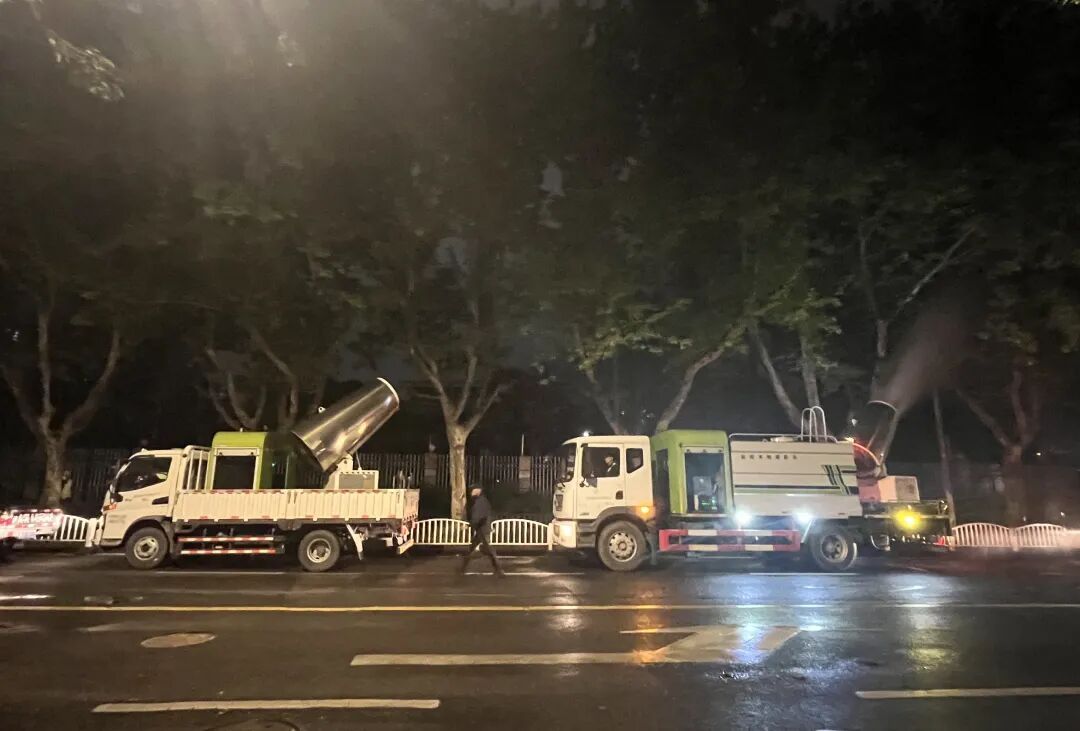 夜幕降临,城市褪去白日喧嚣,水产路永清路段却是一派忙碌景象。晚上9点,由风炮车、雾炮车、高压洒水车和清扫车组成的治理车组准时集结,一场“冲、洗、扫”一体化的飞絮阻击战正式打响。大功率风炮车率先作业,强劲气流将悬铃木枝头的果毛吹落;紧随其后的雾炮车喷出细密水雾,让飞絮快速沉降;高压洒水车冲洗路面,再由清扫车及时清理,形成闭环作业模式,避免飘絮二次飞扬。